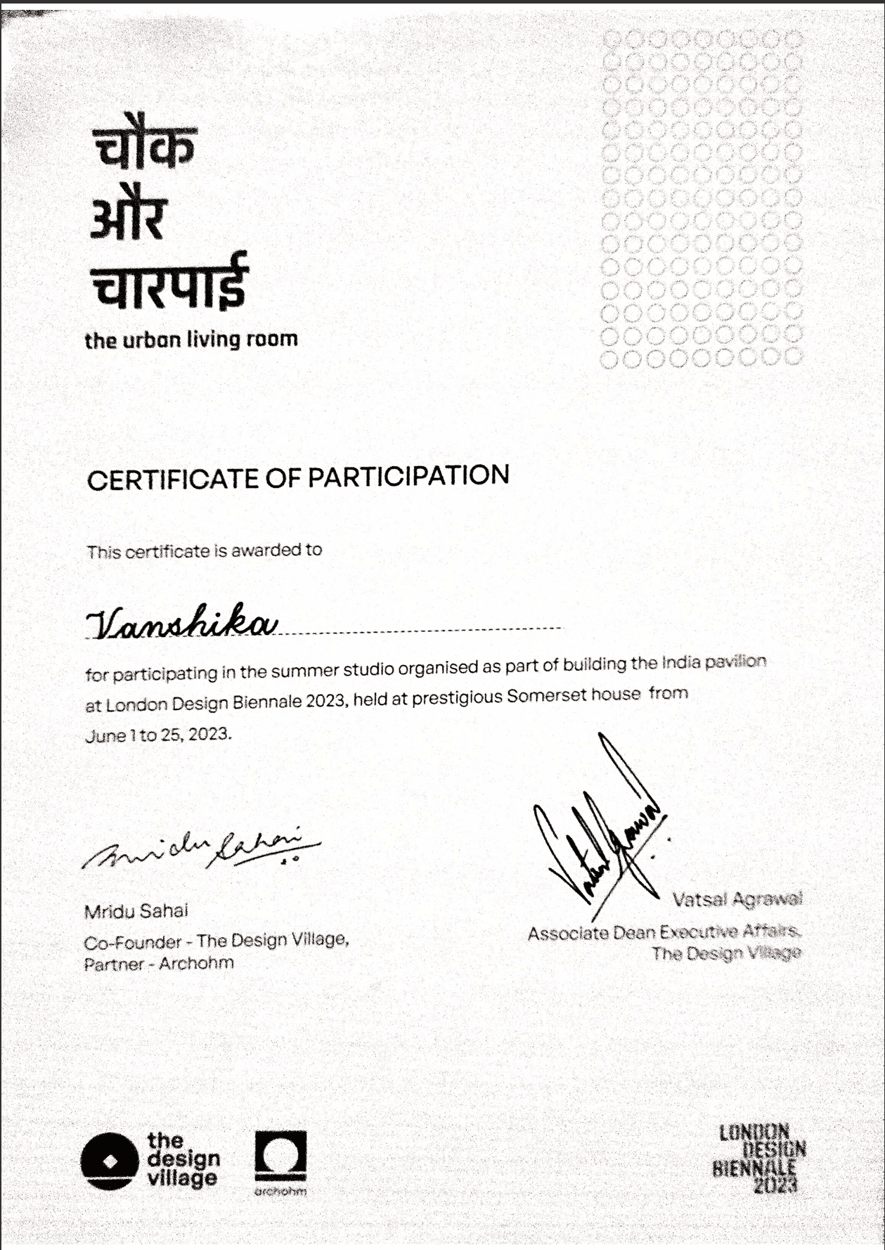 In June 2023, I had the privilege of representing India at the London Design Biennale. Working alongside Studio Archohm and The Design Village, we constructed the Indian Pavilion at Somerset House. The pavilion featured a distinctive facade adorned with terracotta cups made from Indian soil. These cups offered visitors a unique tactile experience, allowing them to physically connect with India. Inspired by the traditional Indian "charpai" woven daybed, our pavilion transformed into a stunning urban sculpture. Standing tall at Somerset House, it provided shade while basking in the British sun. The intricate weave of the charpai created a mesmerizing play of light and shadow, evoking the lively atmosphere of an Indian street market, or "chowk." This captivating display served as a tribute to contemporary Indian cityscapes.
